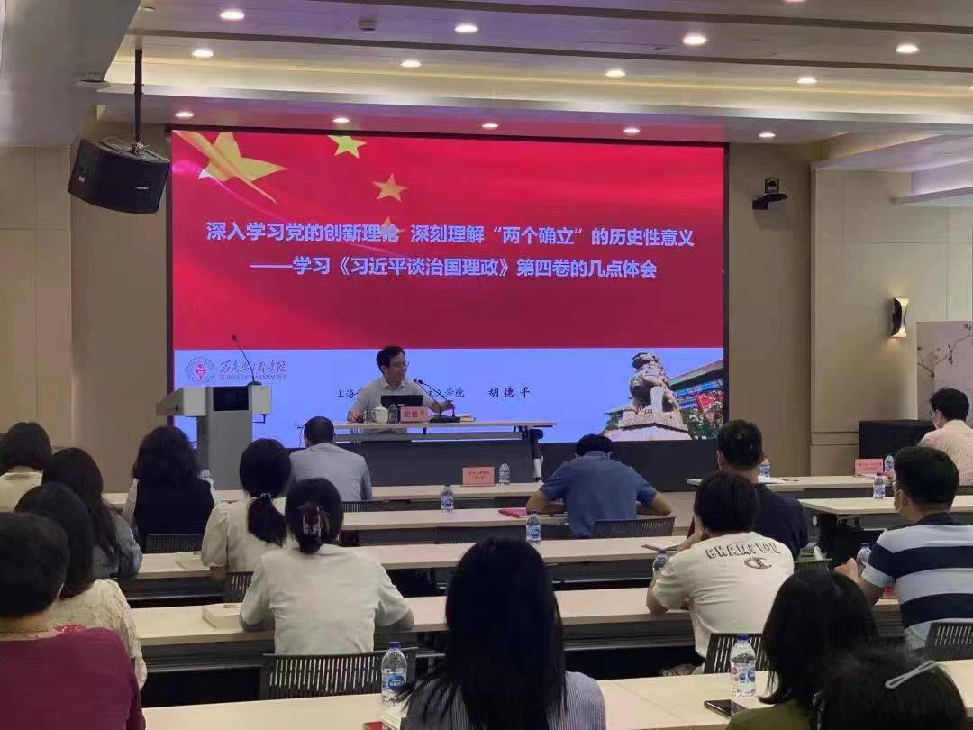 胡德平教授以“深入学习党的创新理论 深刻理解‘两个确立’历史性意义——学习《习近平谈治国理政》第四卷的几点体会”为主题,从时代背景、内容体系及行动自觉三方面对第四卷内容进行了全方位、多角度、纵深性的阐释。