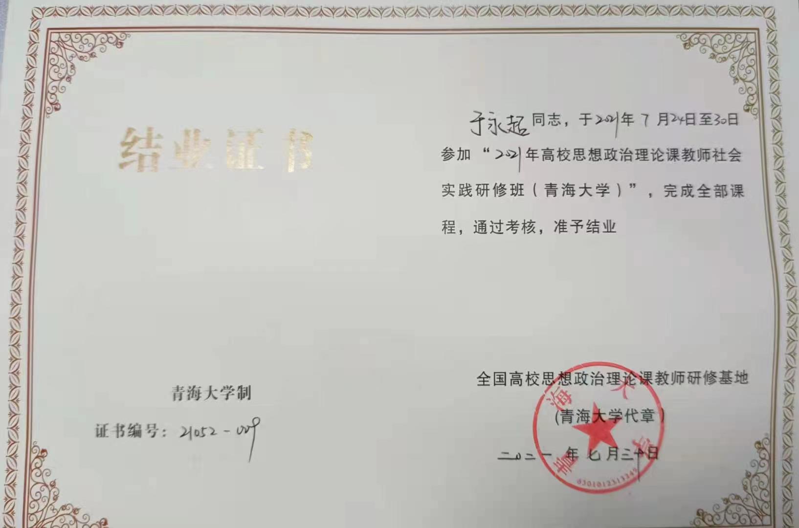 7月24日-7月30日,由教育部组织,青海大学承办的2021年全国高校思政课教师暑期社会实践研修班(21052)在青海西宁展开了为期一周的实践研修,公司教师于永超参加学习并顺利结业。