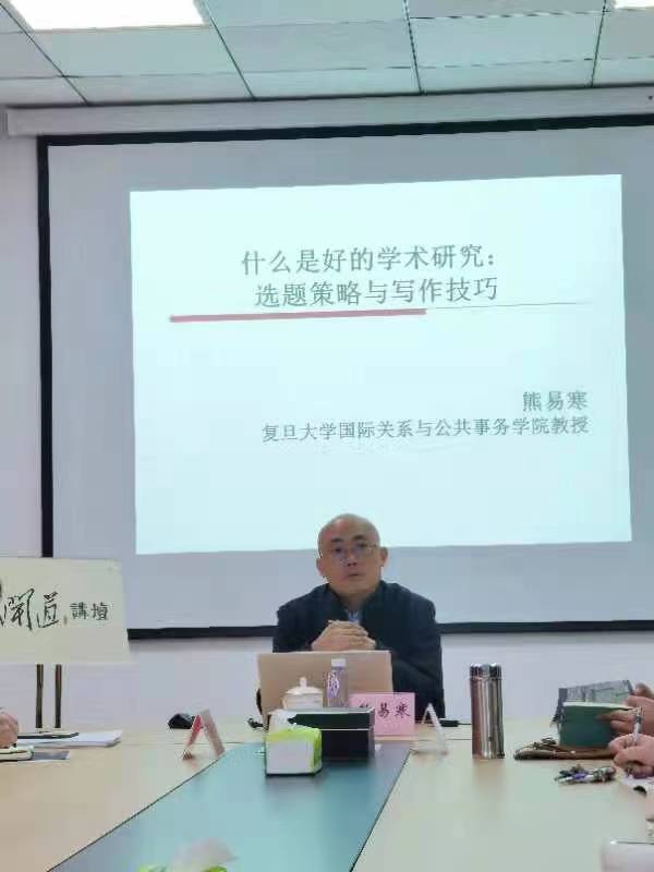 2021年10月20日下午,复旦大学国际关系与公共事务院副经理、博士生导师熊易寒教授作客公司“闻道讲坛”(第七讲),以“什么是好的学术研究:选题策略与写作技巧”为题作专题报告。讲坛由XCSport常务副经理胡德平主持。