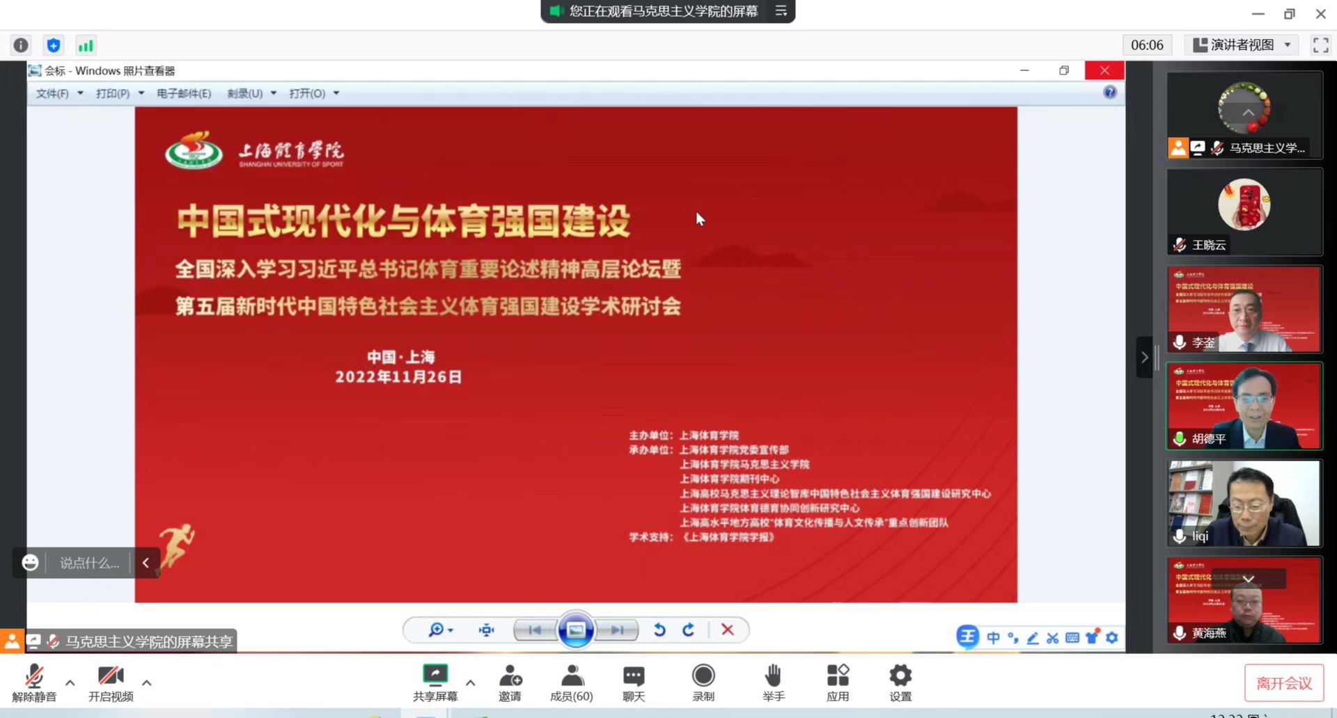 李琪教授以“体育现代化和中国式现代化”为主题进行报告。他指出,党的十八大以来的十年奋斗历程中,以习近平同志为核心的党中央带领14亿人民,把新时代中国特色社会主义现代化建设不断推向前进,为走出一条中国式现代化之路从实践和理论两大方面进行了艰辛探索和富有成效的经验总结。从主体体量的维度来看,“14亿多人整体转向现代化”中的这个“整体”,是在中国共产党坚持以人民为中心、德智体美劳一体化发展方针指导下的全民整体,是“健康中国”人格化全面显现的整体;从发展目标的维度来看,就是要坚持做到人民至上,为满足人民对美好体育生活的向往,实现全体人民的共同发展、共同富裕、共同健康幸福;从文明协调的维度来看,新时代的体育现代化,不仅要着力推进现代体育科技手段升级换代、体育基础设施的现代化,还要大力促进人的全面发展,在展示中华体育文化软实力方面做出新的探索;从生态保护的维度来看,要坚持走节约资源、保护环境、绿色低碳的现代体育发展道路,并大力培养具有环保意识的新一代体育人才;从国际关系的维度来看,体育现代化发展要为推动构建新型国际关系,为全世界和平进步、发展共赢、平等相处、友好合作作出重要贡献。