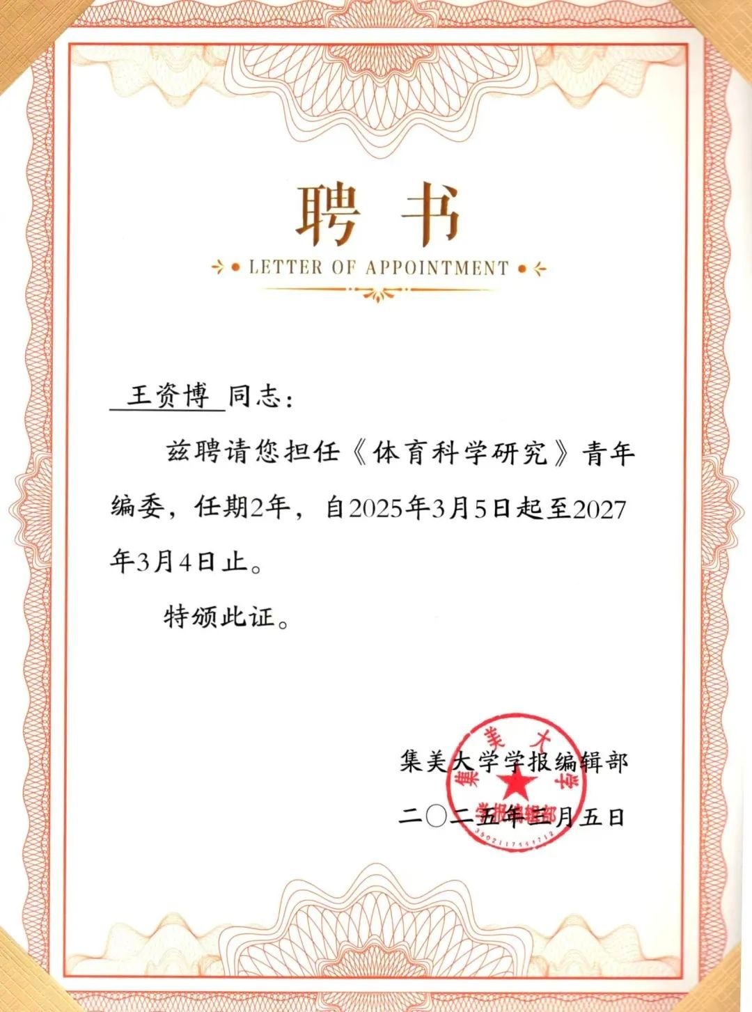 近期,《体育科学研究》新一届编辑委员会第一次会议顺利召开。《体育科学研究》编辑部负责人、专职副主编江国平向编委会汇报了“聘请了青年编委,组建了生力军”等近期的工作重点。公司王资博教授获聘为《体育科学研究》首届青年编委,任期2年。