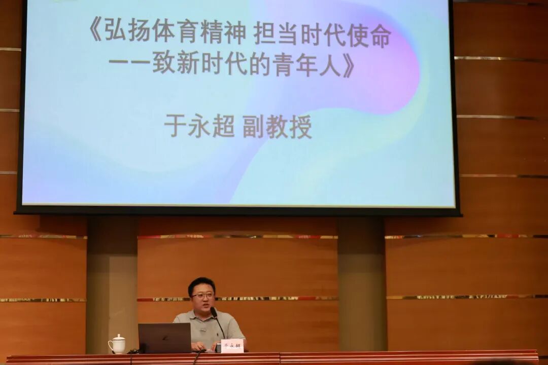 于永超副教授以“弘扬体育精神 担当时代使命——致新时代的青年人”为题,从“体育是什么”的问题出发,在从近代中国到新中国再到新时代的中国的历史长河中,结合体育在民族与国家的发展中所承担的历史使命与具备的重要作用,详实而又具体地解读了体育的本质与内涵;同时以经典的体育事件和体育人物为载体、以奥林匹克精神和中华体育精神为主要内容回应了“什么是体育精神”。于永超副教授结合时代发展所带来的客观要求、党和人民的殷切期望以及习近平总书记对于新时代青年人的谆谆教诲,对于新时代青年人所应担负的历史使命做了明确的讲解,并期望所有同学都能够做“有精气神的新时代青年”,不负韶华、不负青春,为国家和民族的未来、为不悔的青春而奋斗。