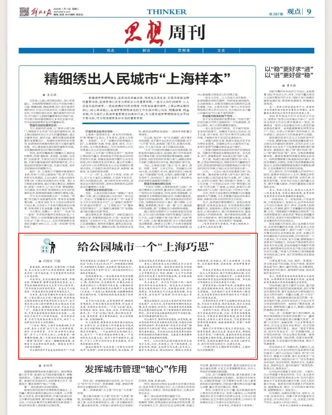 公司青年教师刘雅埙博士作为第一作者撰写的理论文章《给公园城市一个“上海巧思”》在2022年1月4日发行的《解放日报(思想周刊)》发表,该文章在“上观新闻”公众号同步推送。
