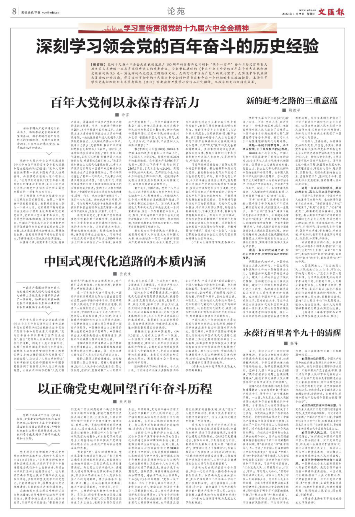 李崟、胡德平、张晓龙、敖天颖、高峰五位教师分别撰写的十九届六中全会精神研究系列理论文章《百年大党何以永葆青春活力》《新的赶考之路的三重意蕴》《中国式现代化道路的本质内涵》《以正确党史观回望百年奋斗历程》《永葆行百里者半九十的清醒》在2022年1月9日出版发行的《文汇报》理论版“论苑”(第8版)刊发。