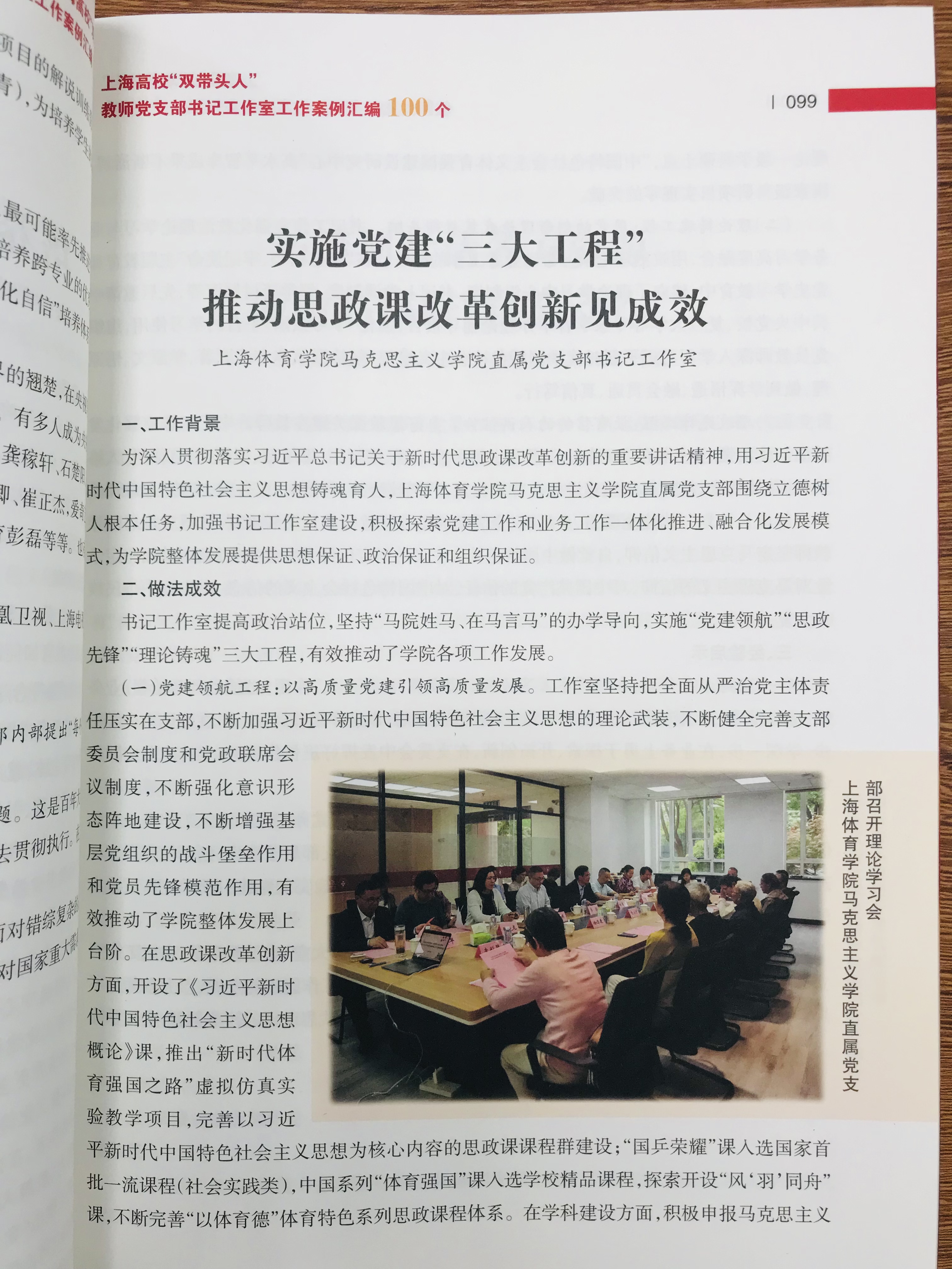 今年是中国共产党成立100周年。近日,由中共上海市教育卫生工作委员会编印的《上海高校“双带头人”教师党支部书记工作室工作案例汇编(100个)》出版,公司直属党支部书记工作案例《实施党建“三大工程” 推动思政课改革创新见成效》入选该案例汇编。