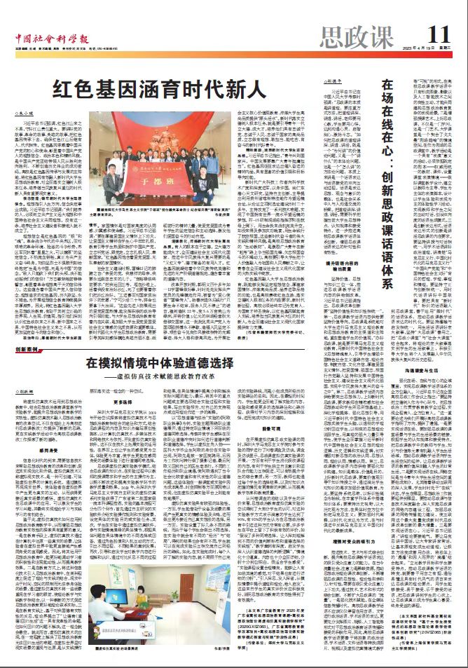 4月19日发行的《中国社会科学报》(第11版)发表公司经理胡德平教授撰写的论文《在场在线在心:创新思政课话语体系》,该论文系胡德平教授主持的国家社科基金高校思政课研究专项“基于老员工接受特点的思想政治理论课教学话语体系创新研究”(20VSZ065) 阶段性成果。