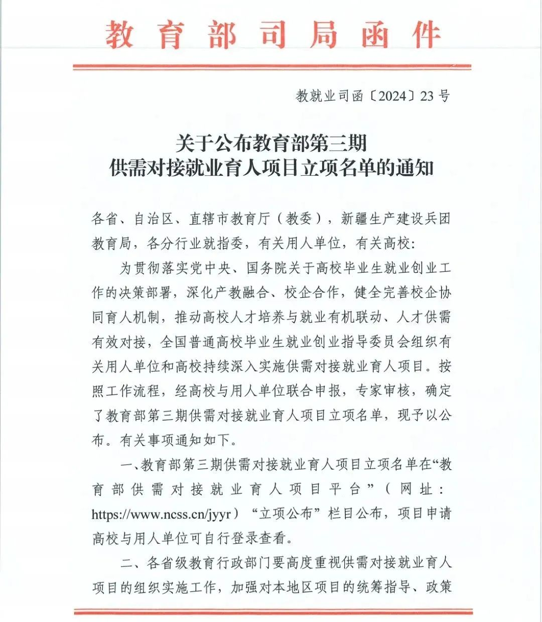 近日,教育部供需对接就业育人项目平台发布了《关于公布教育部第三期供需对接就业育人项目立项名单的通知》(教就业司函〔2024〕23号),公司获批“思想政治教育数字化人才”定向人才培养培训项目1项。公司直属党支部副书记、副经理马焕主持的“思想政治教育数字化人才”定向人才培养培训项目获立项。