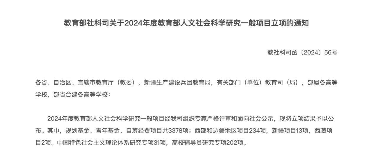 2024年度教育部人文社会科学研究一般项目包括规划基金、青年基金、自筹经费项目、专项任务项目以及西部和边疆地区项目等,本专项任务项目所属学科门类为“马克思主义/思想政治教育”,项目研究期限为3年。